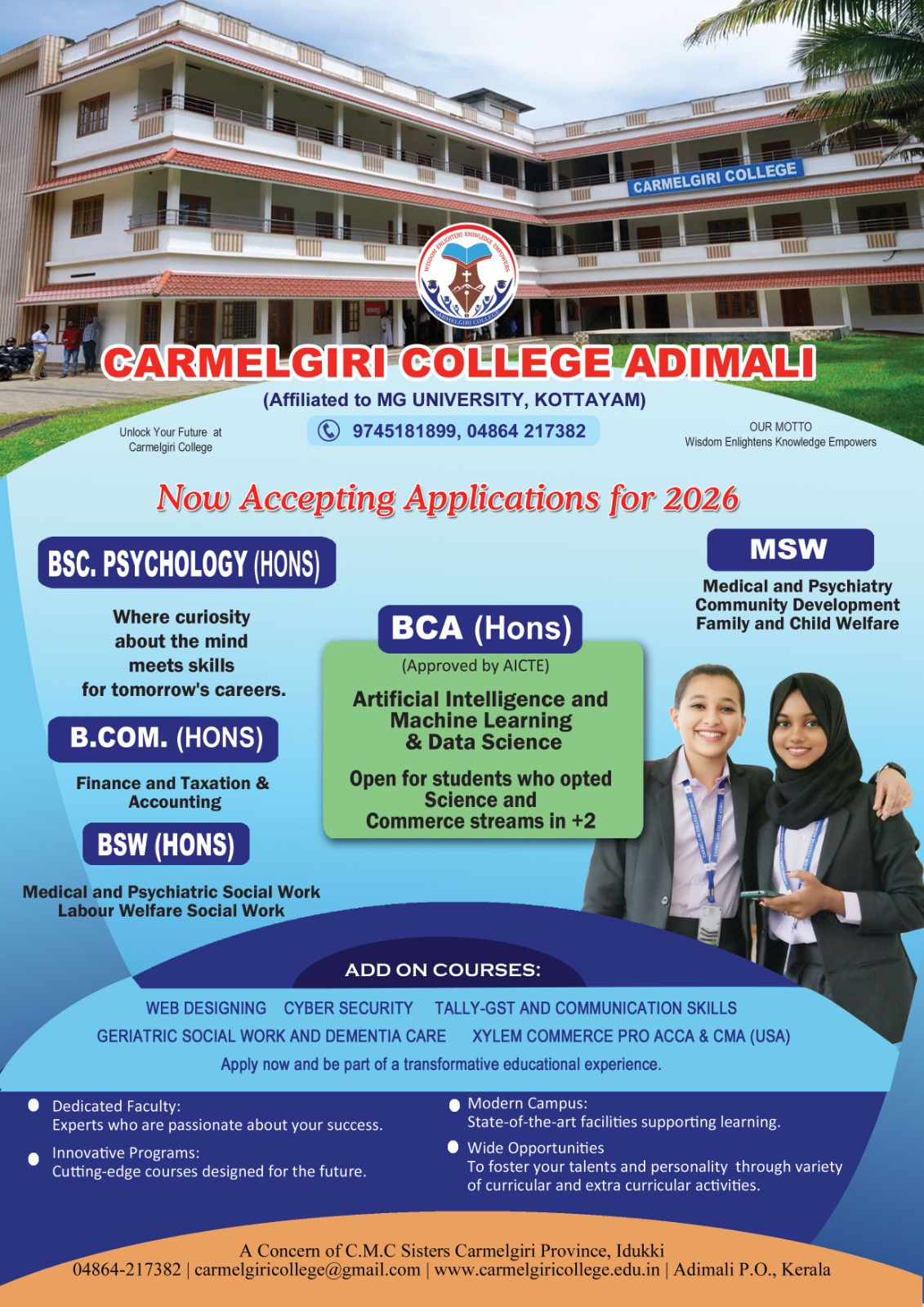 At Carmelgiri College, Adimali, we are dedicated to fostering an environment where academic excellence is complemented by the overall growth of our students. Our mission is to empower the next generation to embrace challenges, think innovatively, and contribute meaningfully to society.